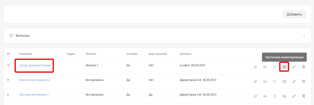 перейти в модуль “Склад” и открыть раздел “Склады”