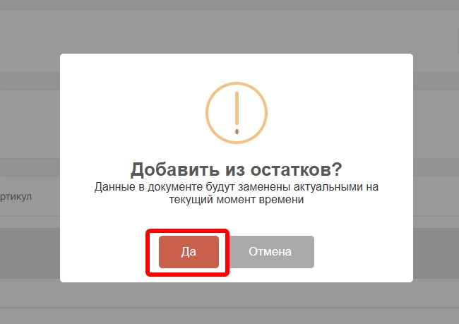 опция “Добавить из остатков” для добавления всех ненулевых номенклатур, которые числятся на данном складе