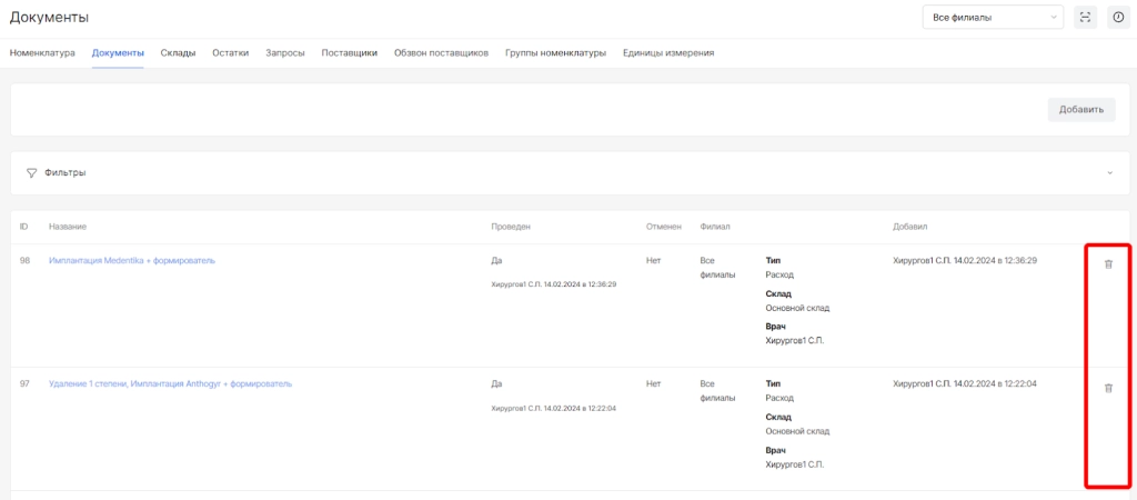 опция удалить документ (доступна только до проведения документа)