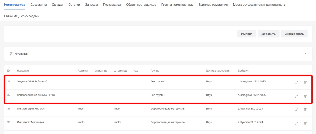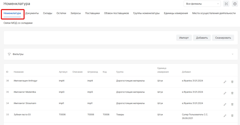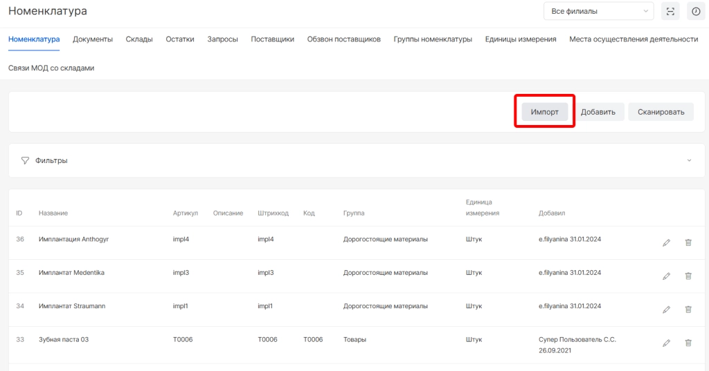 Готово. Импортированные номенклатуры отобразятся в списке и с ними станут доступны опции редактирования и удаления