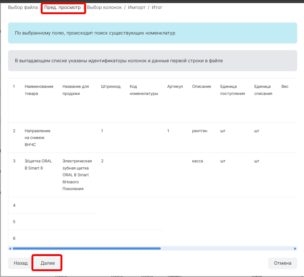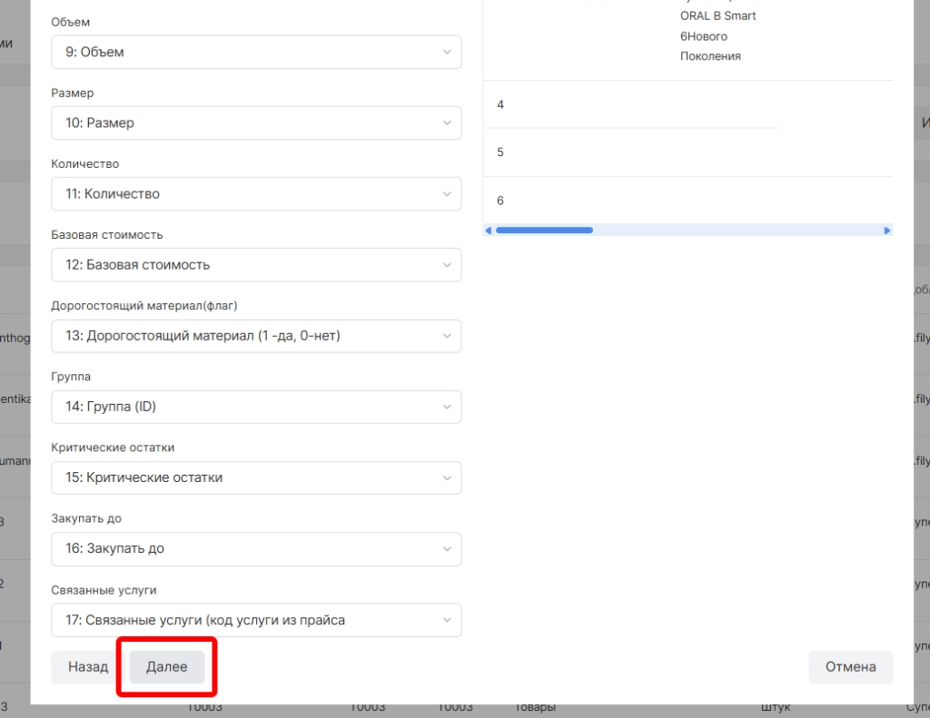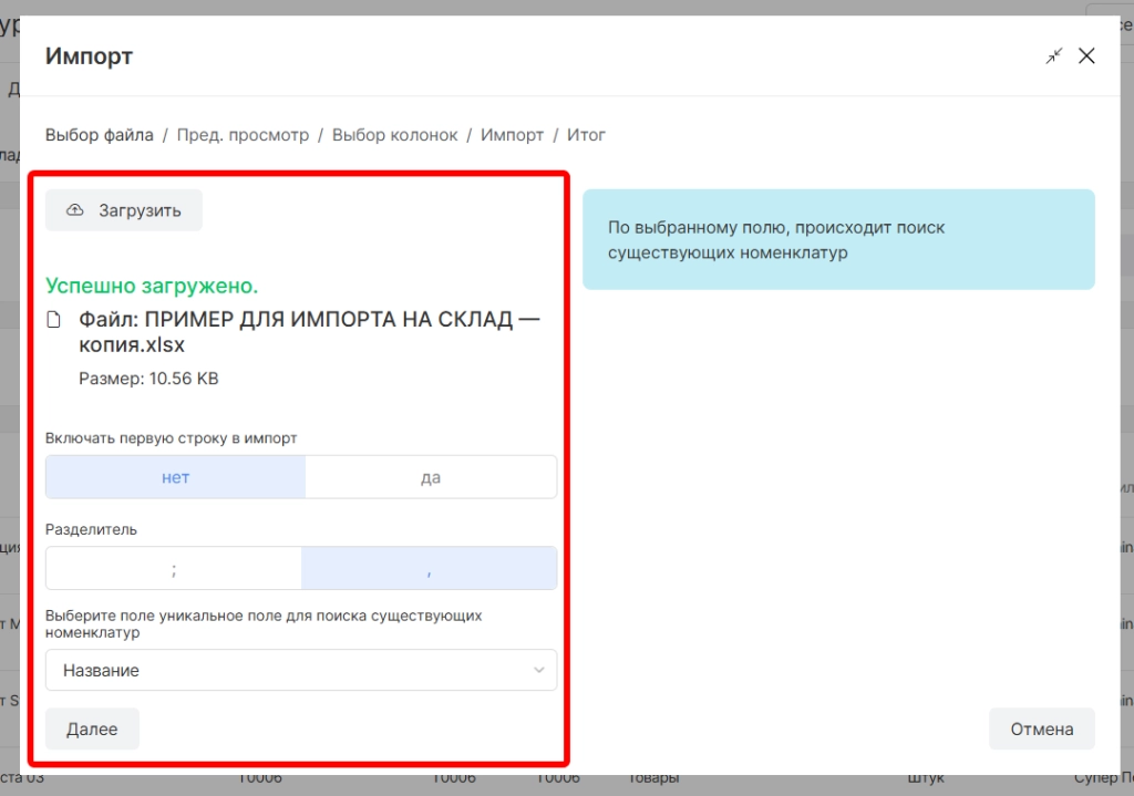 После указания соответствия колонок и параметров необходимо нажать “Далее”.