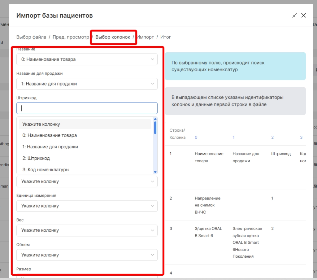 Далее необходимо указать соответствие столбцов загруженного документа с параметрами в системе.