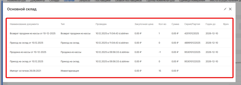 При нажатии на наименование склада откроется просмотр истории движений по номенклатуре на складе