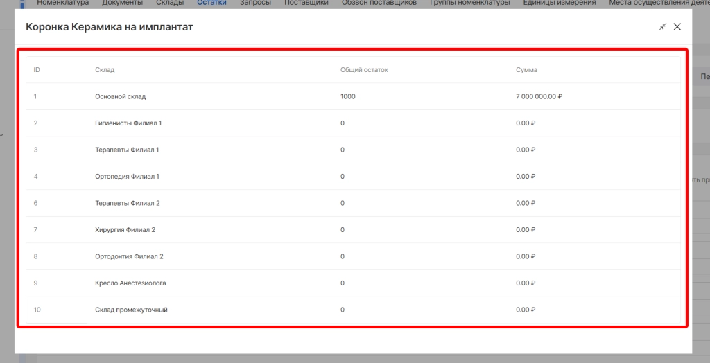 При нажатии на значения в колонках “Общий остаток” и “Сумма товаров на складе” откроется детализация по количеству и сумме номенклатуры на складах, где она участвует