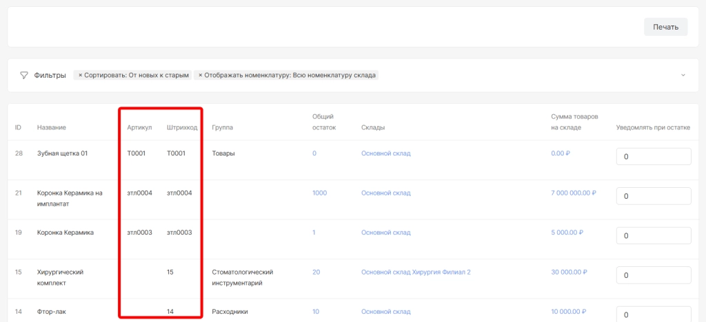 артикул и штрихкод номенклатуры
