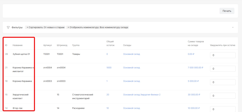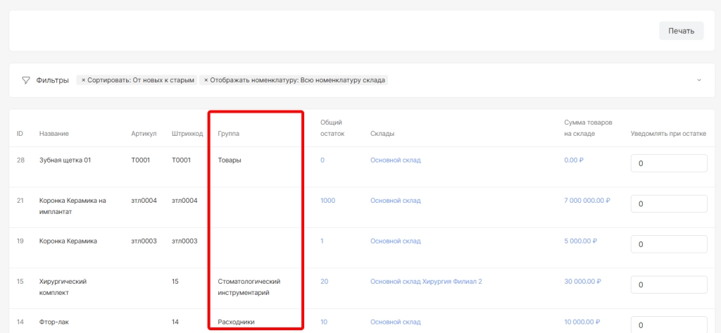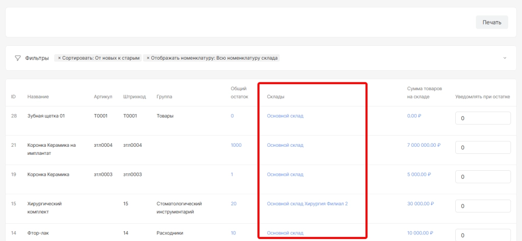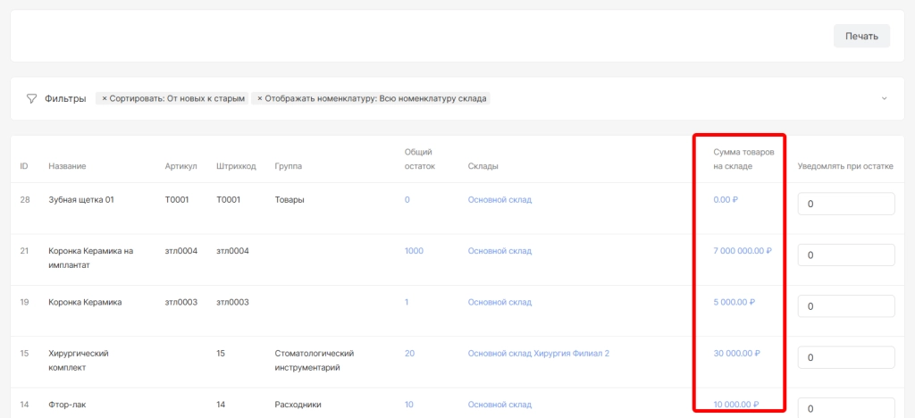В разделе «Остатки» отображается список всех номенклатур с указанием складов хранения, текущего остатка и суммы остатков.