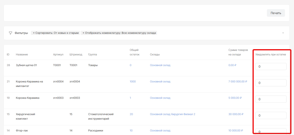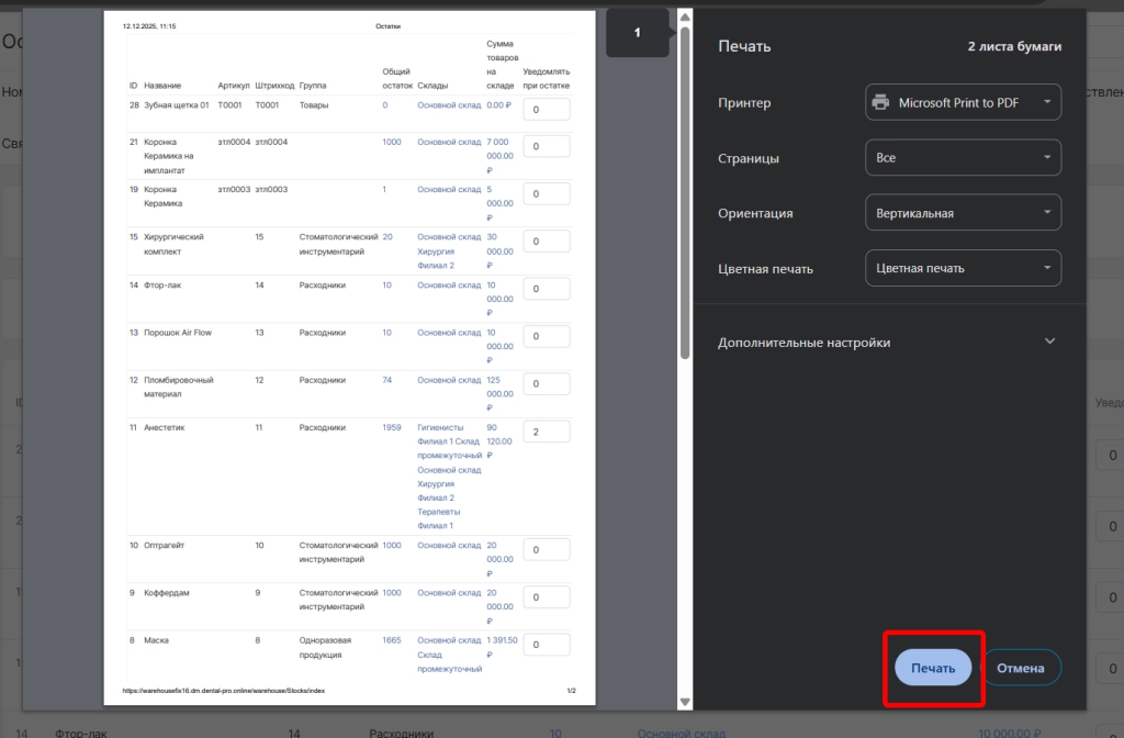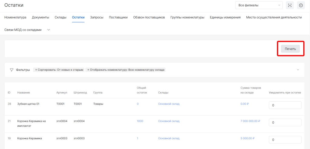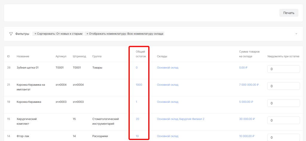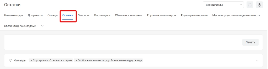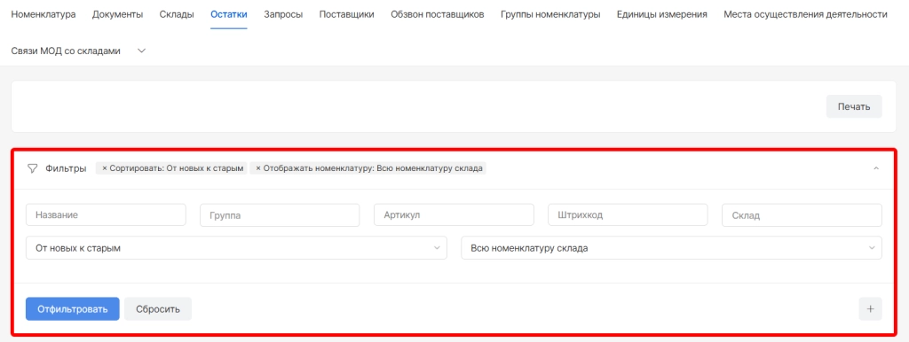 При необходимости список остатков можно распечатать.Для этого вверху страницы необходимо выбрать опцию “Печать”
