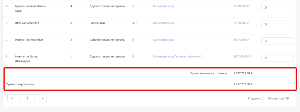 общая сумма всех номенклатур на странице по всем складам