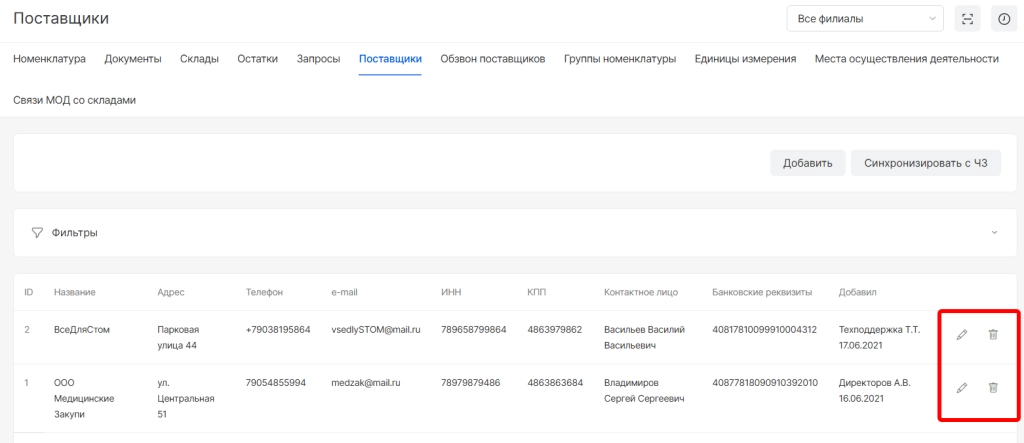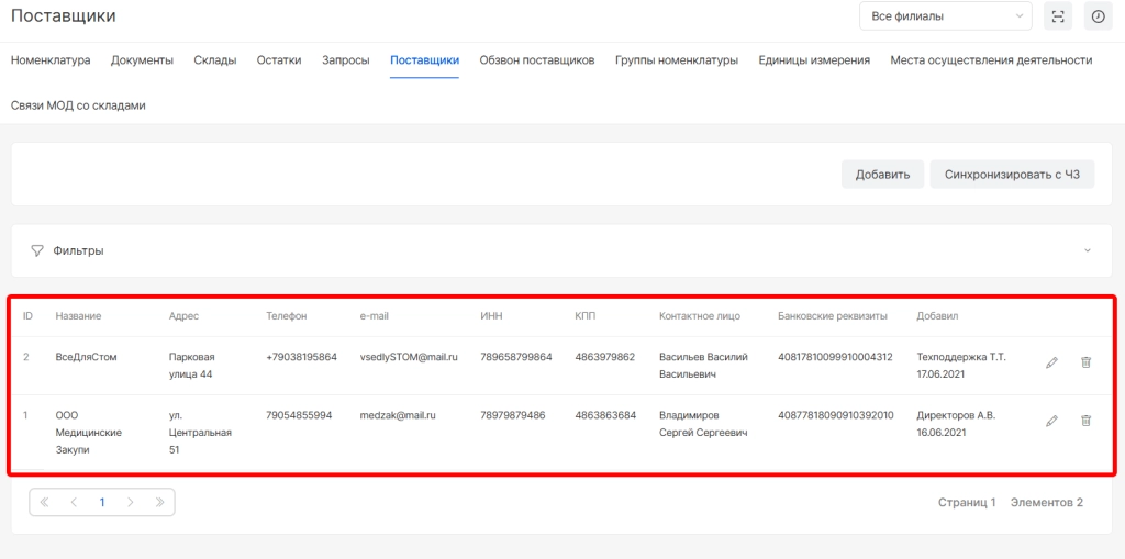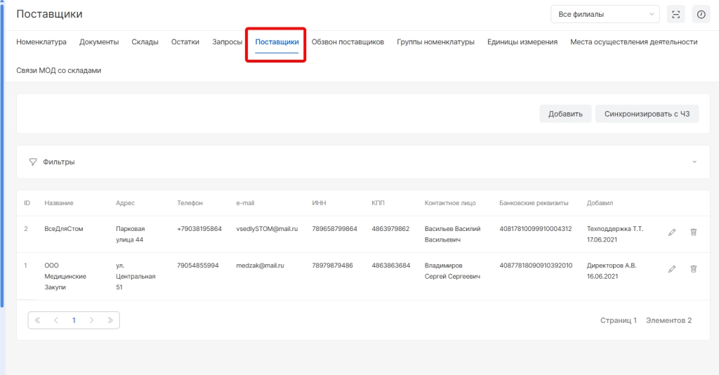 После сохранения поставщик будет добавлен в список. В списке поставщиков информация отображается по колонкам: