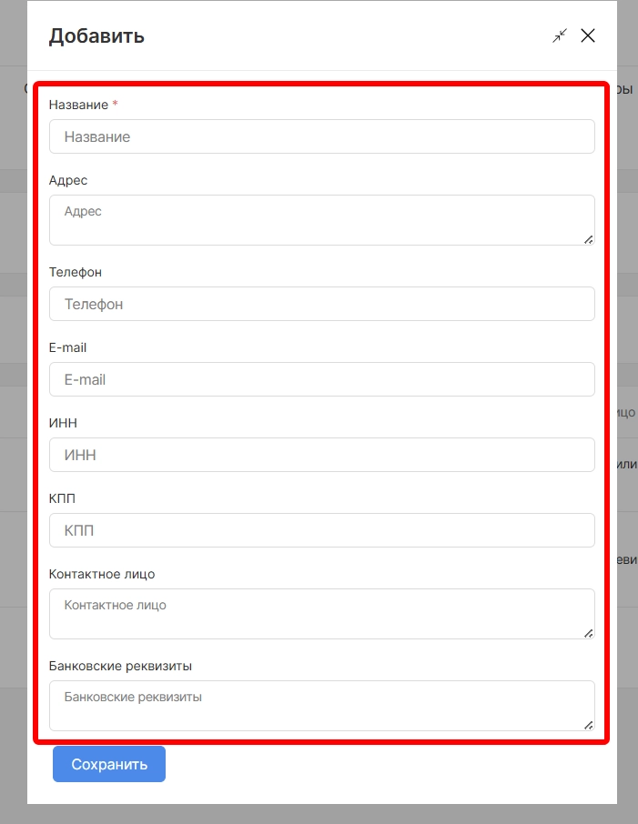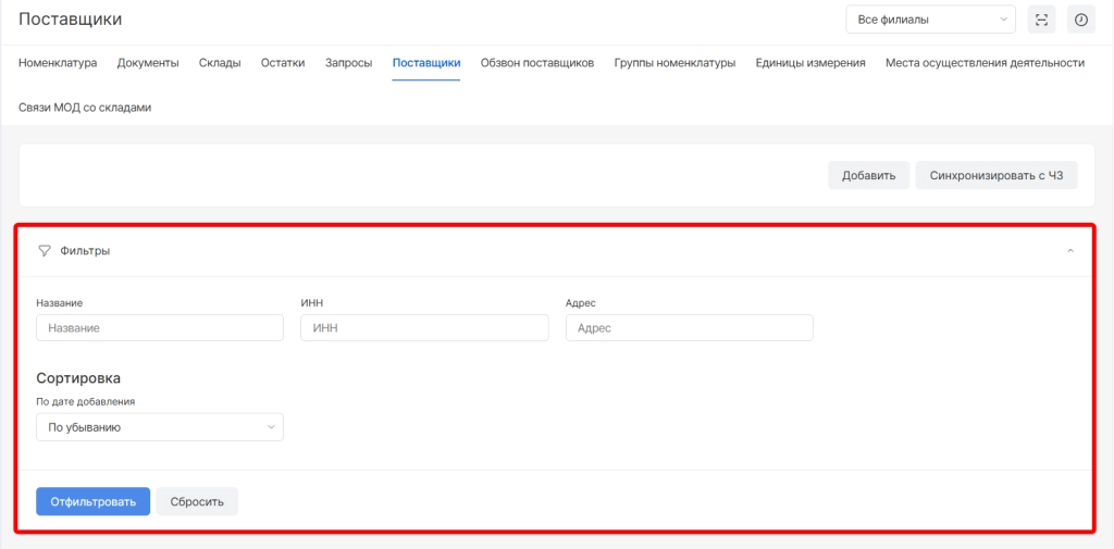 Для добавления нового поставщика необходимо вверху страницы выбрать опцию “Добавить”