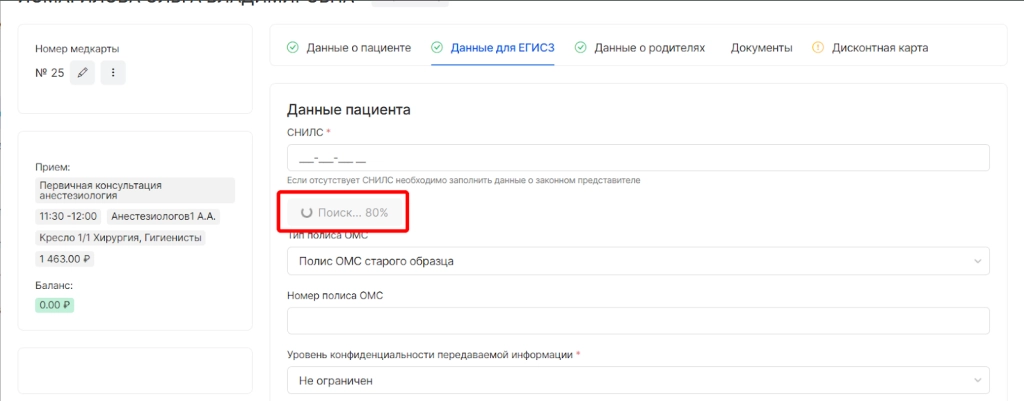 После выбора опции начинается поиск СНИЛС пациента