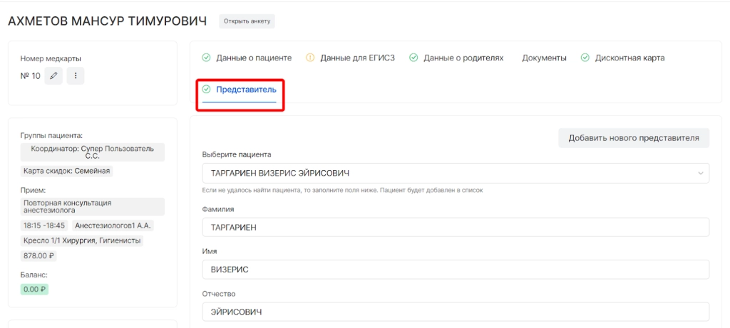 4. Добавили возможность указания представителя для совершеннолетних пациентов.