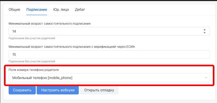 1. Добавили настройку, позволяющую указать из какого поля брать номер телефона пациента, если для несовершеннолетних пациентов номер телефона родителя указывается в основном поле “Контактный номер”