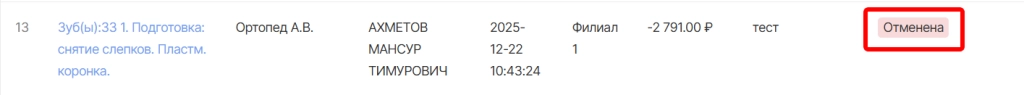 в открывшейся форме указать причину отмены и подтвердить сохранение