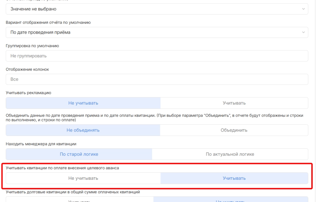 Дополнительно,в настройки данного отчета добавили опцию “Учитывать квитанции по оплате внесения целевого аванса”, позволяющую включить или отключить попадание суммы целевого аванса в колонки по оплате