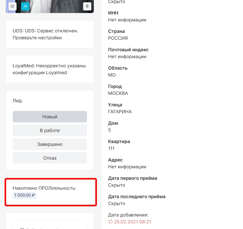 Информация о накопленных бонусах пациента будет отображаться также в его инфокарте в поле “ПРОлояльность”