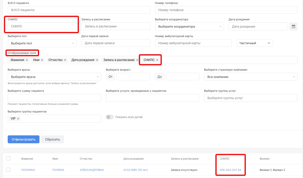 6. Добавили новое поле фильтрации и соответствующую колонку “СНИЛС” в модуль “Список пациентов”