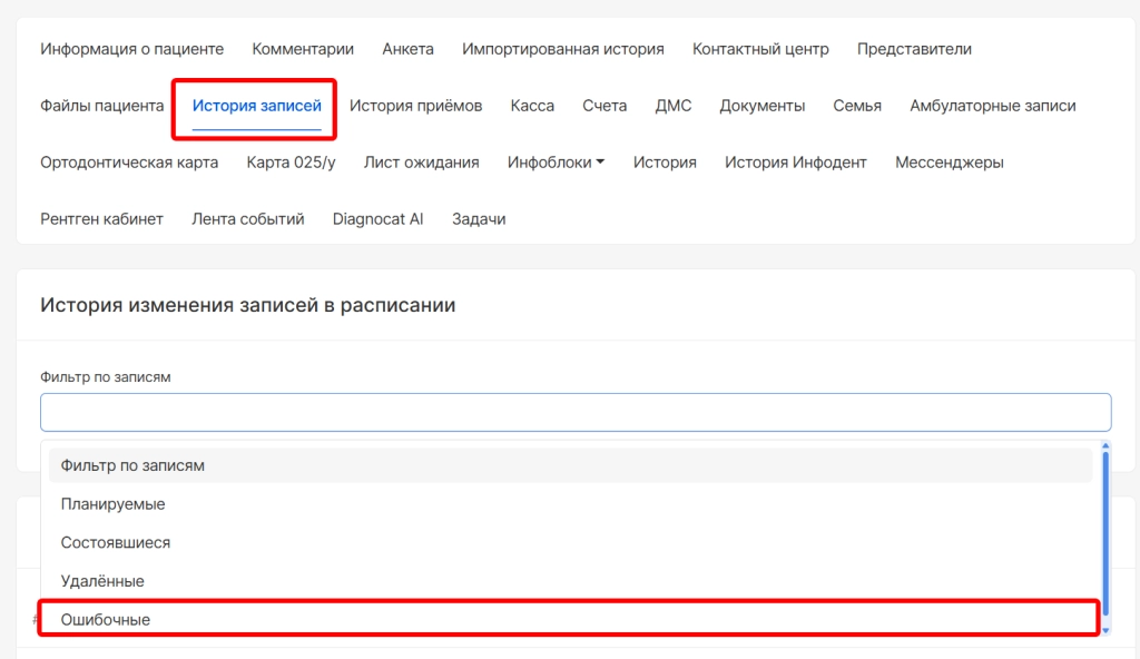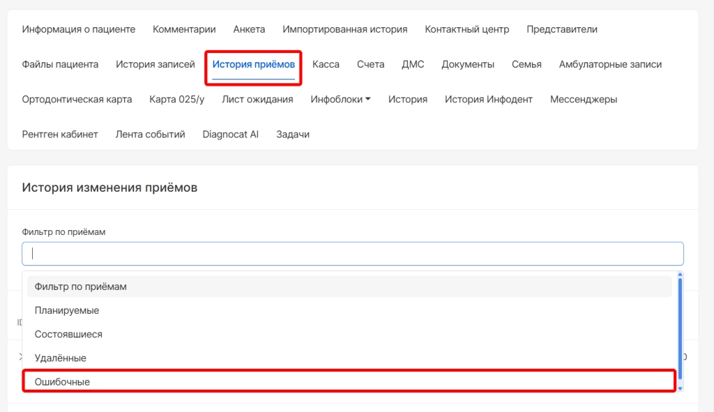 5. Добавили новый фильтр по ошибочным приемам в разделы инфокарты пациента:
