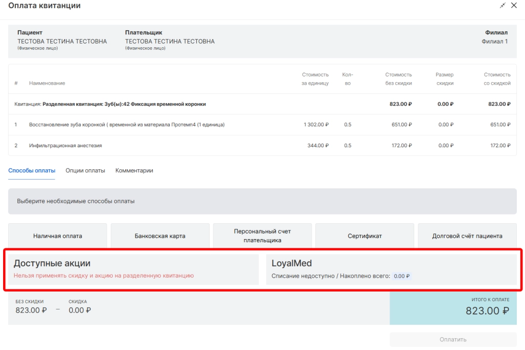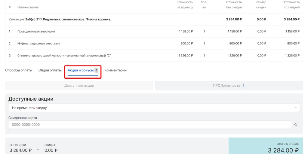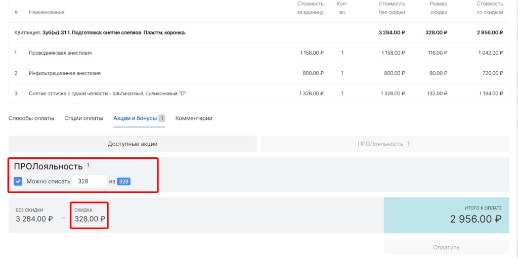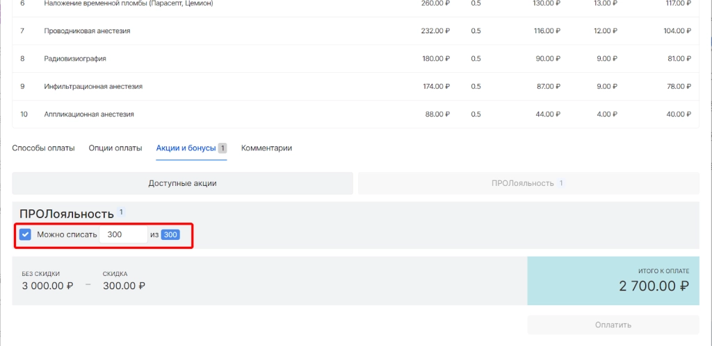 После указания суммы бонусов пациента для списания они отобразятся как скидка и можно завершить процесс оплаты.