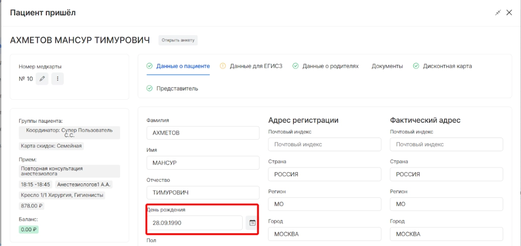 ВНИМАНИЕ! Опция будет недоступна при отсутствии заполненных полей по паспортным данным пациента
