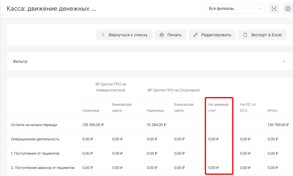 2. В отчет с типом “Касса: движение денежных средств” добавили новую колонку “На заемный счет”, отображающую оплаты квитанций с заемного счета