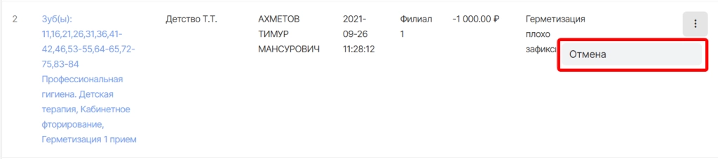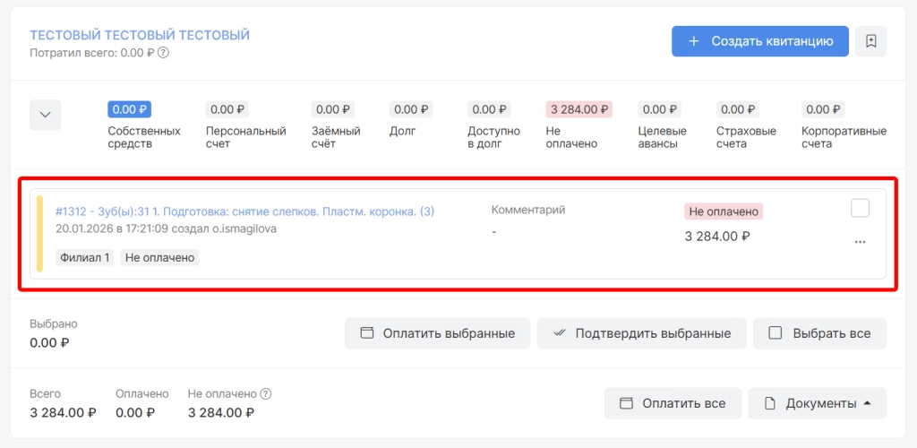 в модуле “Касса” необходимо найти квитанцию пациента