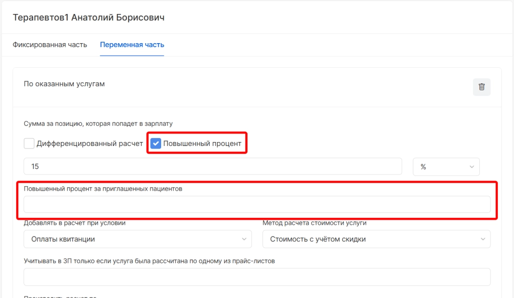 указать значение процента в поле “Повышенный процент за приглашенных пациентов”