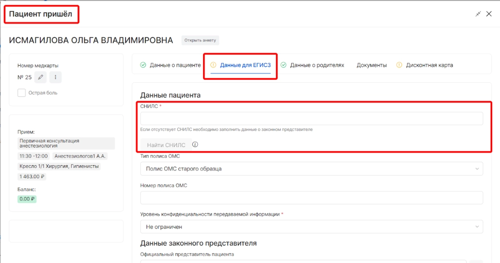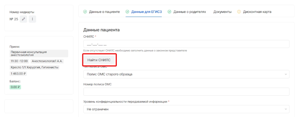 В форму “Пациент пришел”,в раздел “Данные для ЕГИСЗ” добавили возможность поиска СНИЛС.