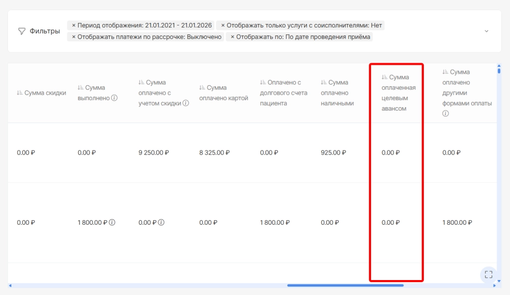 1. В отчет с типом “Заработные платы врачей, обновленный” добавили новую колонку “Сумма, оплаченная целевым авансом”