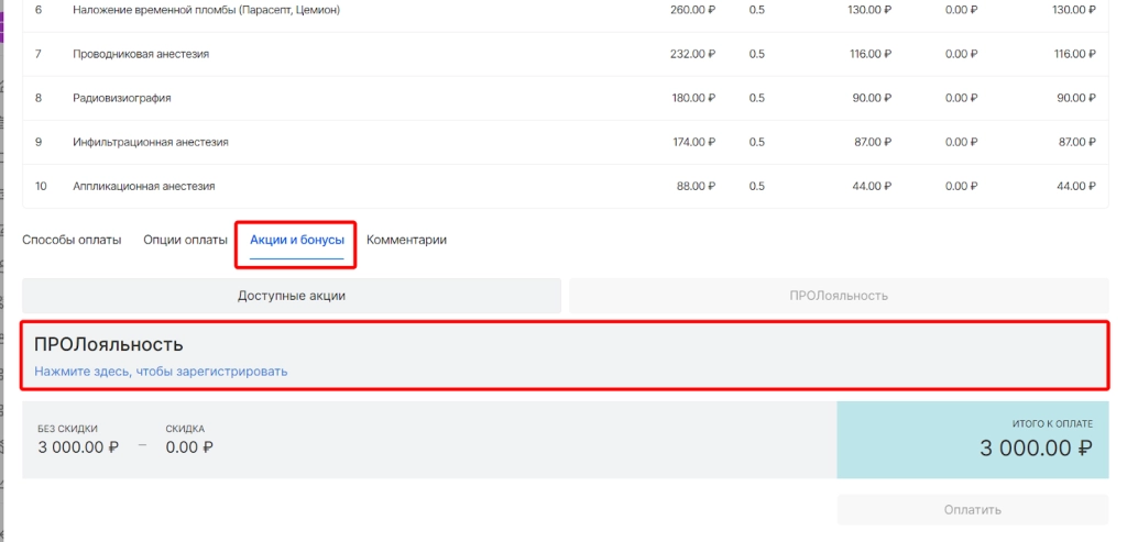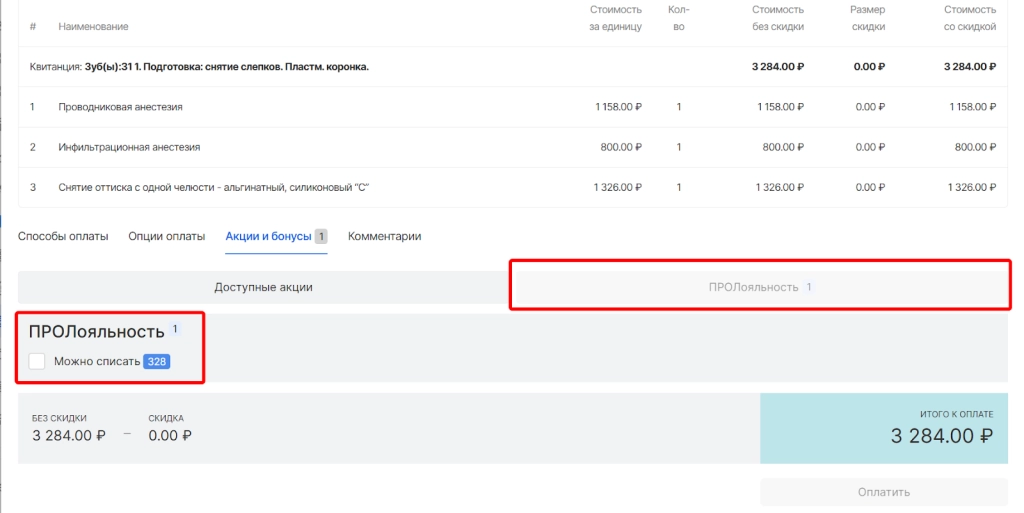 далее необходимо выбрать колонку “ПРОлояльность” и ознакомиться с количеством бонусов пациента, доступные для списания
