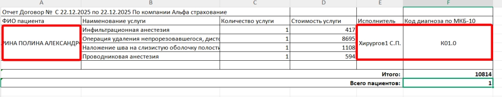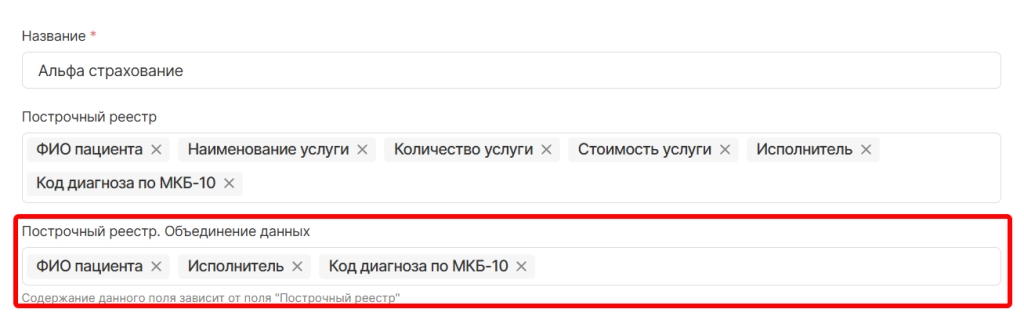 Добавили возможность объединения данных строчек в одну ячейку при формировании реестра. Для использования функционала необходимо при добавлении или редактировании страховой компании в поле “Построчный реестр. Объединение данных” указать данные, строки которых должны быть сгруппированы по строке пациента