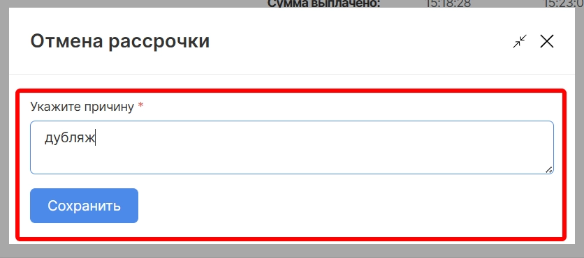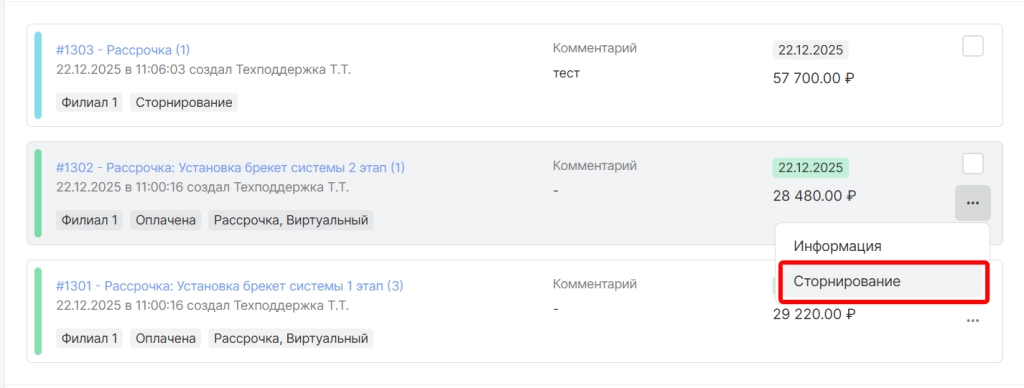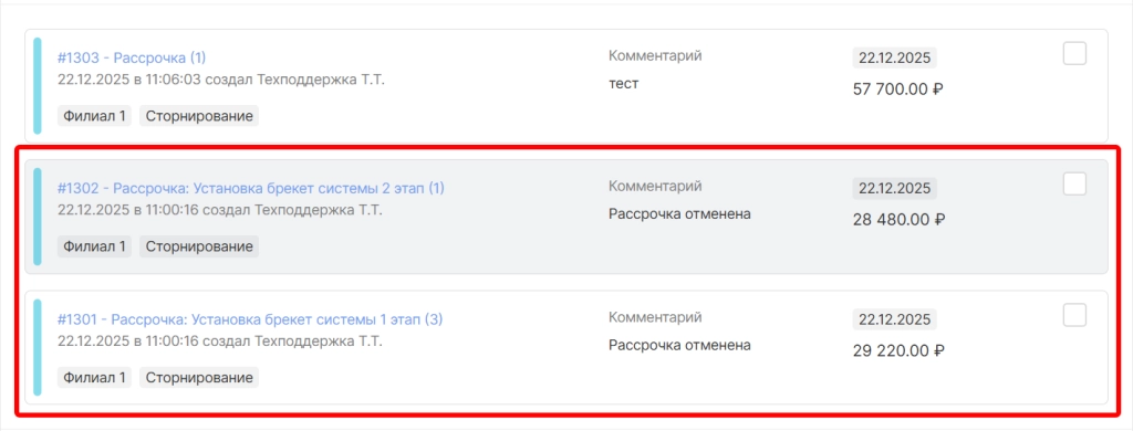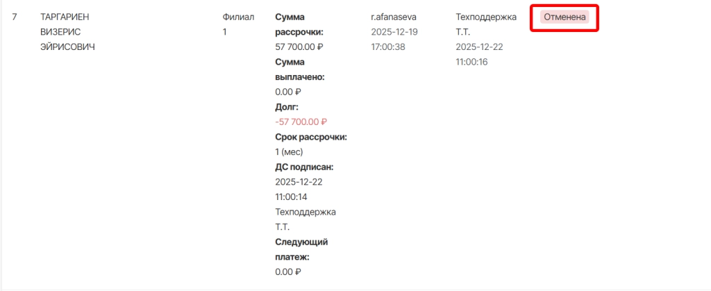 Отмена рассрочки невозможна для рассрочек со статусом “выполнено” или если есть хотя бы один оплаченный платеж по рассрочке. При необходимости можно воспользоваться опцией “сторнирование” платежа по рассрочке.