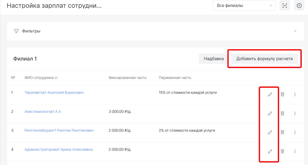 На открывшейся странице необходимо выбрать опцию “Добавить формулу расчета” (если у сотрудника ранее не было настроено) или опцию “Редактировать” (если у сотрудника ранее было настроено)