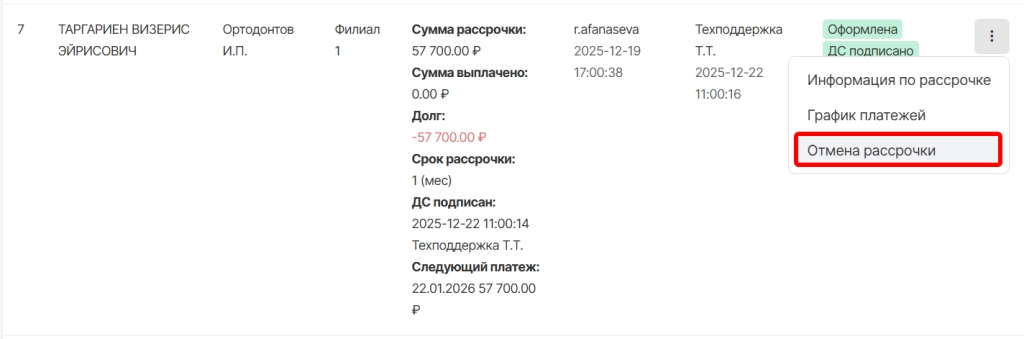 в опциях рассрочки необходимо выбрать “Отмена рассрочки”