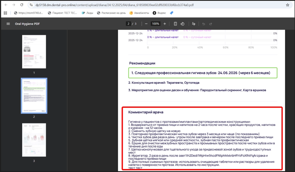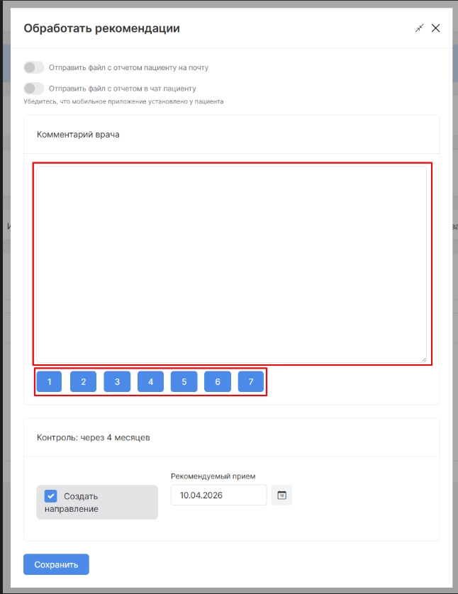 Для указания комментариев доктора необходимо при обработке рекомендаций написать или выбрать шаблон текста рекомендаций доктора