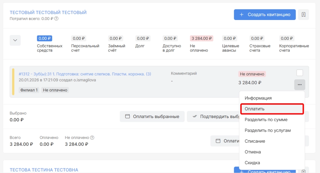 на квитанции пациента выбрать опцию “Оплатить”