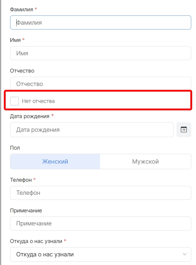 2. При добавлении нового пациента добавили возможность оставлять поле “Отчество” незаполненным. Для использования функционала необходимо при заполнении ФИО пациента выбрать опцию “Нет отчества”