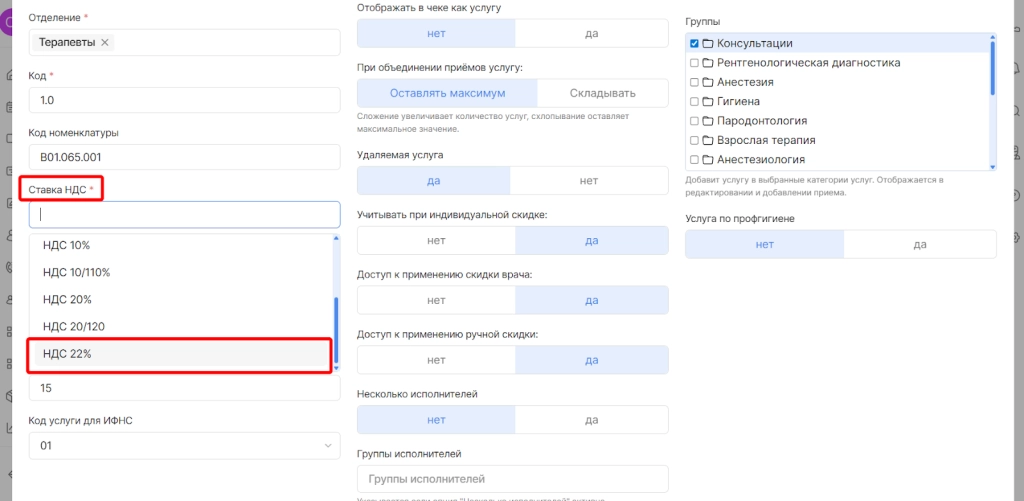 Добавили вариант ставки для налоговой в 22% при настройке услуг прайс-листа
