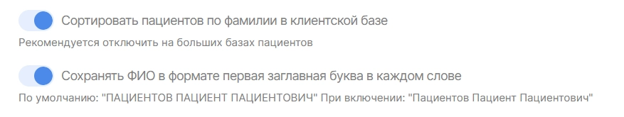 3. Добавили настройку, позволяющую прописывать ФИО пациента не только заглавными буквами, но и заглавными и прописными. Дополнительно добавлена настройка сортировки пациентов по фамилии.