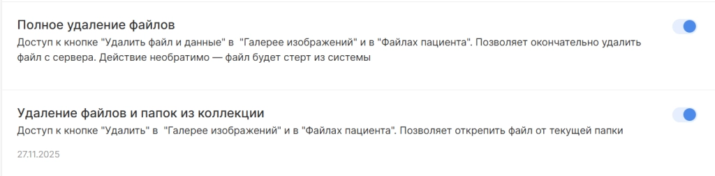 - Добавили новую привилегию, которая дает доступ к удалению файла и папки в инфокарте пациента в разделе “Файлы пациента”