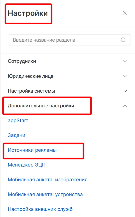Для корректной работы функционала необходимо также правильно настроить источники рекламы. Для этого необходимо перейти в модуль “Настройки” и “Дополнительные настройки”, выбрать раздел “Источники рекламы”