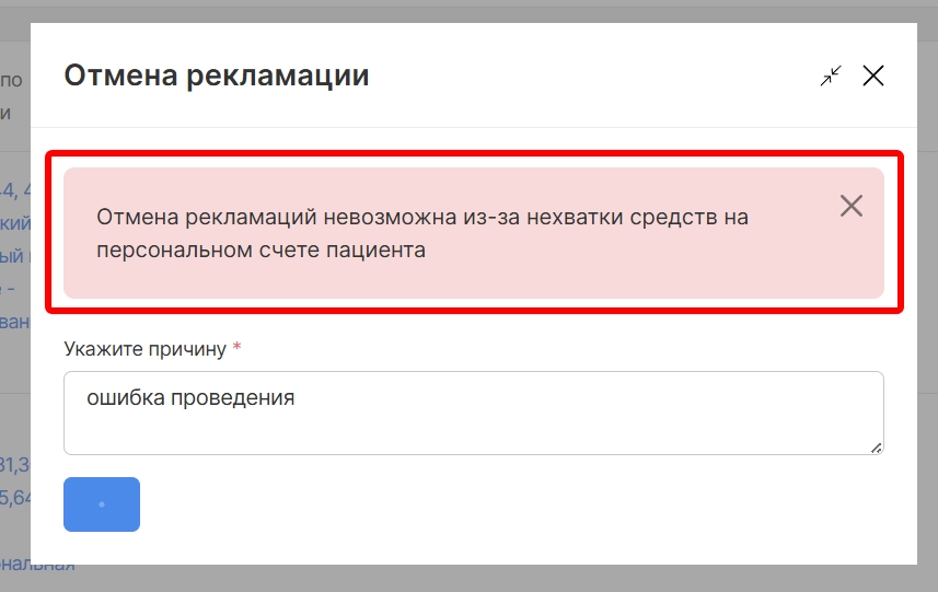 В случае недостаточности средств на персональном счете для проведения отмены рекламации отобразится соответствующее уведомление