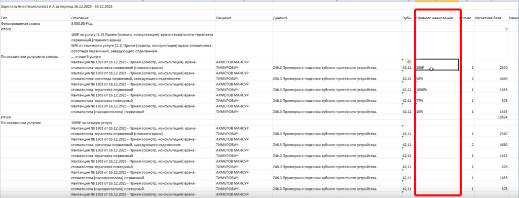 2. В экспортируемый файл подробной детализации по рассчитанной зарплате добавили новую колонку “Правило начисления”, в которой отображается значение ставки за услуги для типа начисления “По оказанным услугам из списка”