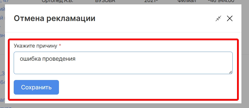в открывшейся форме необходимо указать причину и подтвердить сохранение