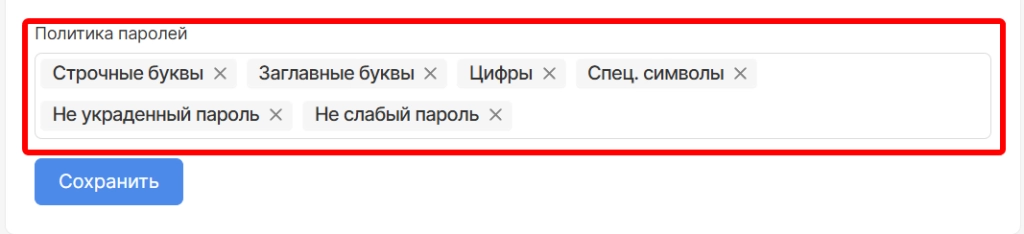 - Усилили безопасность паролей пользователей и добавили проверку на необходимые значения при смене пароля и входе в систему. Дополнительно была добавлена настройка политики паролей, позволяющая указать необходимые требования к паролю