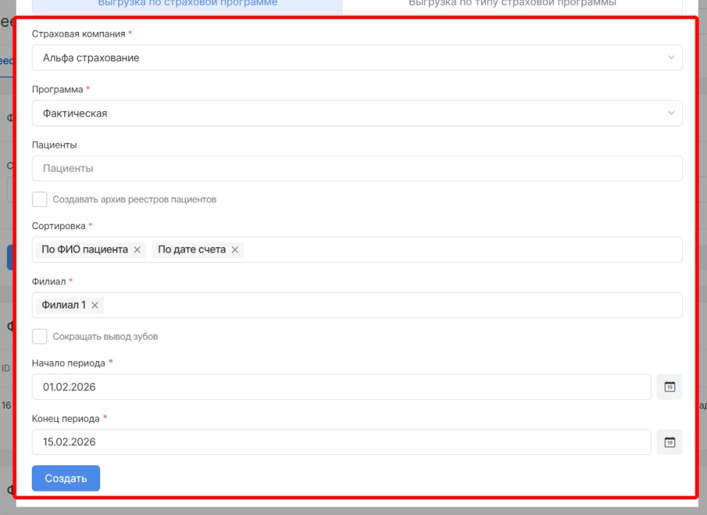 ВНИМАНИЕ! Поле по выбору пациентов должно оставаться пустым, тогда реестр сформируется по всем пролеченным страховым пациентам за период и такой реестр можно будет отправить через Контур.Страхование