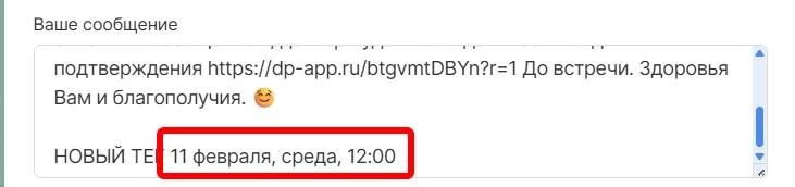 3. Для шаблонов смс добавили новый тег, позволяющий прописывать дату приема с полным наименованием даты и месяца, днем недели и времени визита: