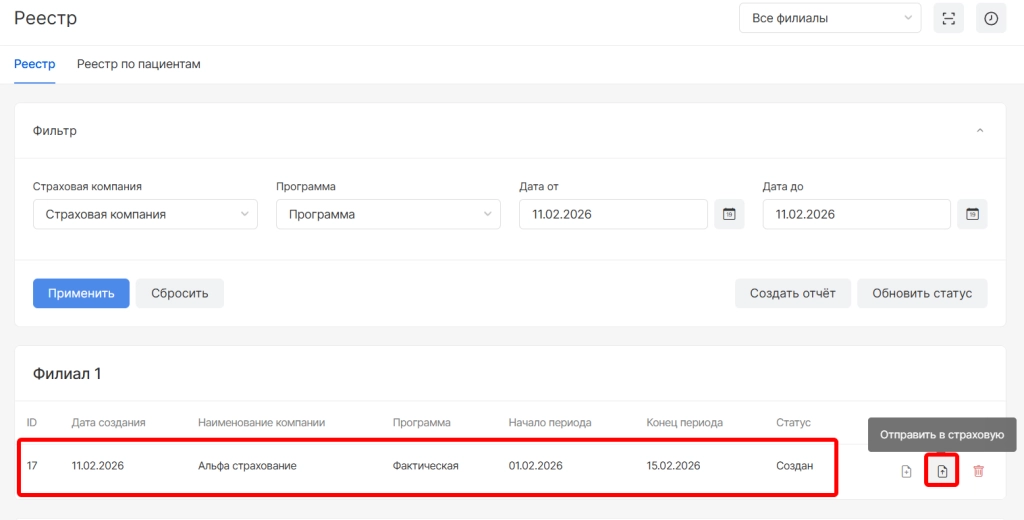 после создания реестр отобразится в списке созданных реестров и необходимо выбрать опцию “Отправить в страховую”