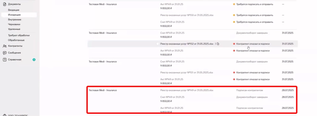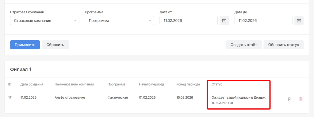 После подписания и отправки страховая компания получает комплект документов и после их проверки на отправленных документах отобразятся статусы: