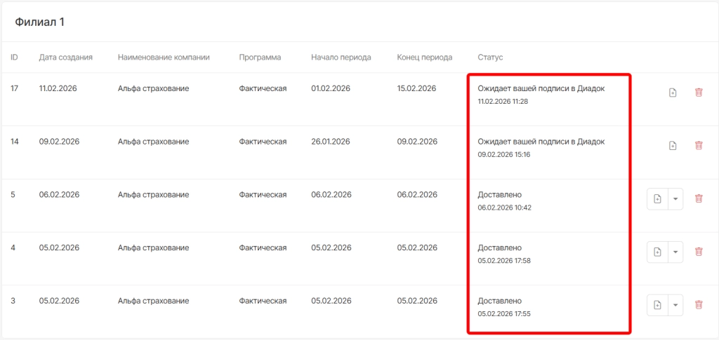 Указанные статусы документов в личном кабинете Контур.Диадок также будут отображаться в списке реестров в DentalPRO